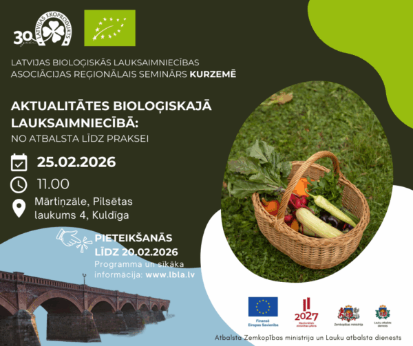 Biedrība “Latvijas Bioloģiskās lauksaimniecības asociācija”, turpinot 2026. gada sākuma reģionālo semināru ciklu bioloģiskajiem lauksaimniekiem, aicina uz semināru “Aktualitātes bioloģiskajā lauksaimniecībā: no atbalsta līdz praksei”. Kurzemniekus pulcēsim Kurzemes sirdī Kuldīgā.